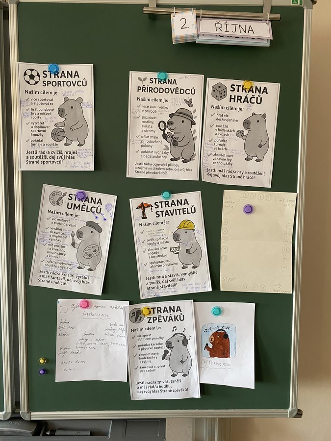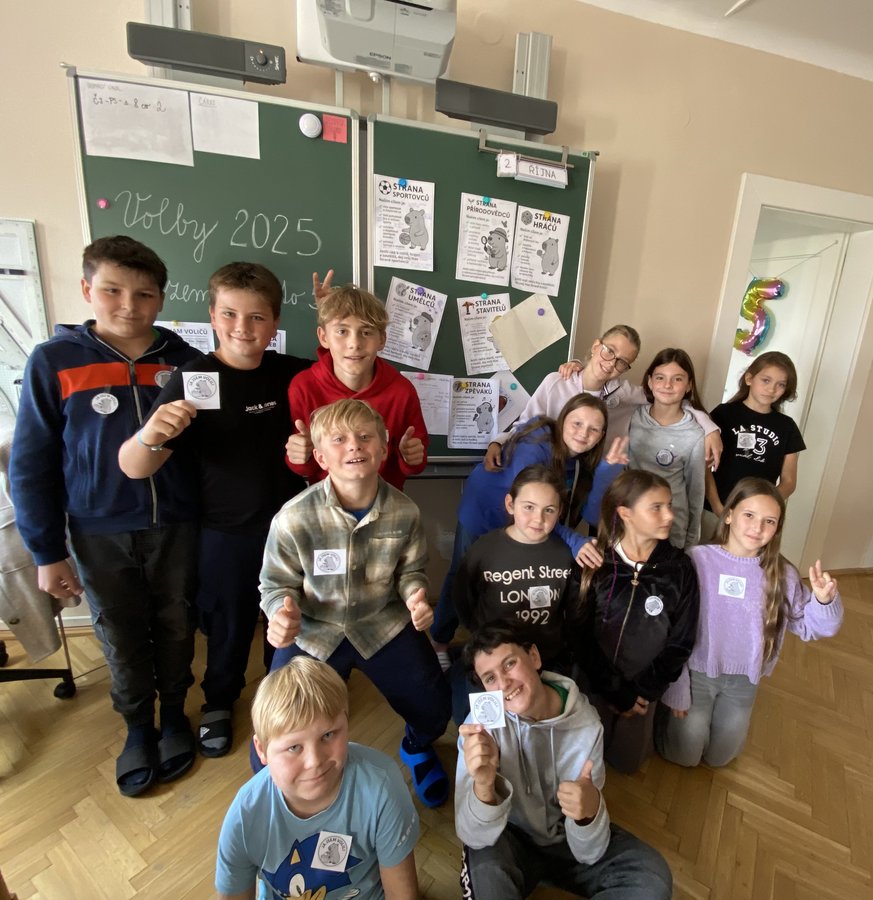 V souvislosti s aktuálními volbami v České republice jsme si i my ve třídě uspořádali vlastní volby. Naše třída se proměnila v malé městečko, ve kterém vznikly různé politické strany. Každá strana si vytvořila volební program, který představila ostatním spolužákům – nechyběly zajímavé nápady, přesvědčivé projevy ani originální plakáty.