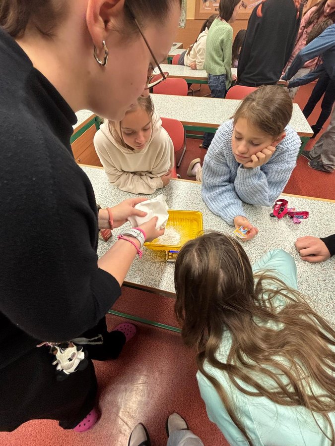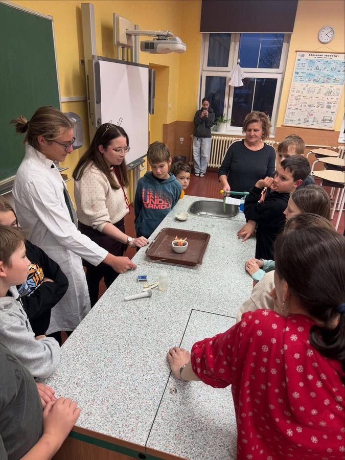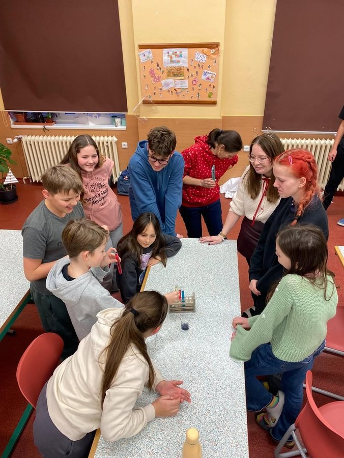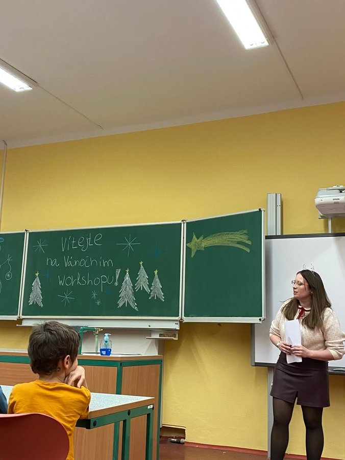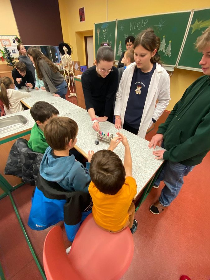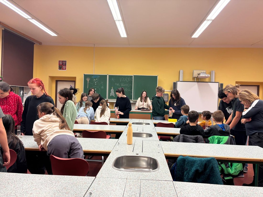 Badatelský kroužek uspořádal pro školní družinu vánoční workshop plný objevování, zábavy a kouzelné atmosféry. Společně jsme se vydali na cestu za hledáním ducha Vánoc, při které nás provázel čertík Bertík. Ten dětem pomáhal plnit úkoly a objevovat tajemství, která se skrývají ve světě pokusů. Během workshopu jsme si vyzkoušeli řadu krásných a fascinujících experimentů, ozdobili jsme si chemický stromeček, a dokonce jsme si sami vyrobili sníh. Celé odpoledne se neslo v radostné a tvořivé náladě, děti byly nadšené, aktivně se zapojovaly a všichni jsme si společně užili spoustu legrace i vánočního kouzla.