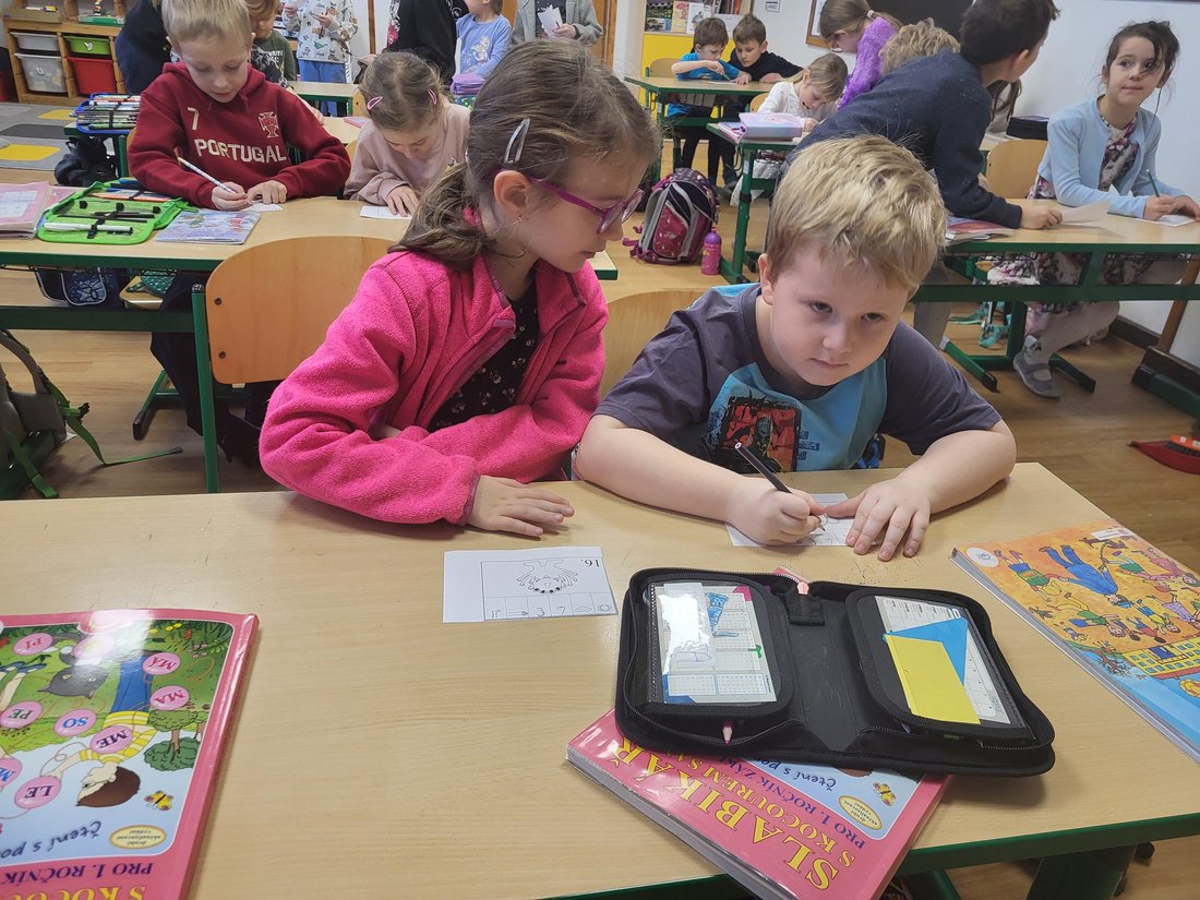 Předškoláci si v obou třídách prohlédli sešity a učebnice prvňáčků, vyzkoušeli si, jaké je to sedět ve školní lavici a samozřejmě si učení vyzkoušeli na vlastní kůži.