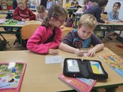 V 1. B si každý prvňák vzal k sobě jednoho předškoláka a společnými silami procvičovali počty do deseti. Zahráli si na interaktivní tabuli matematické domino. Z češtiny prvňáci ukázali, která písmena už umí. Tvarovali je ze svého těla.