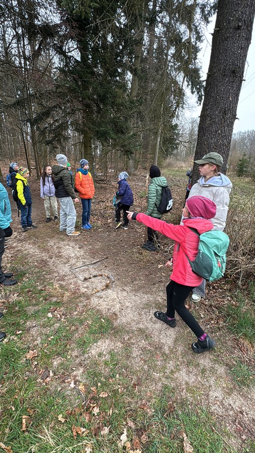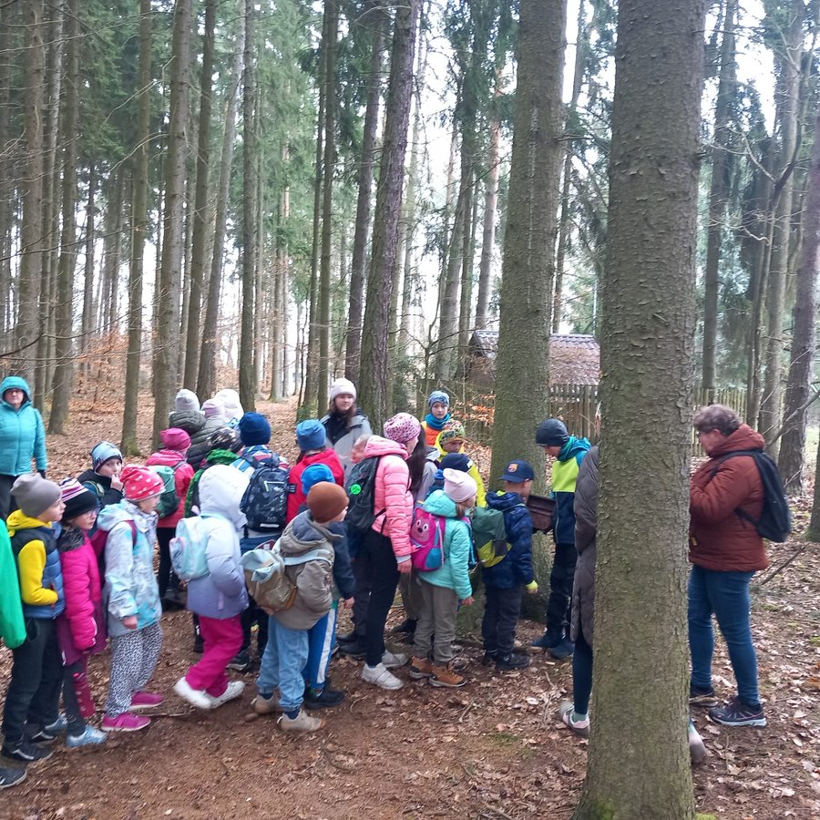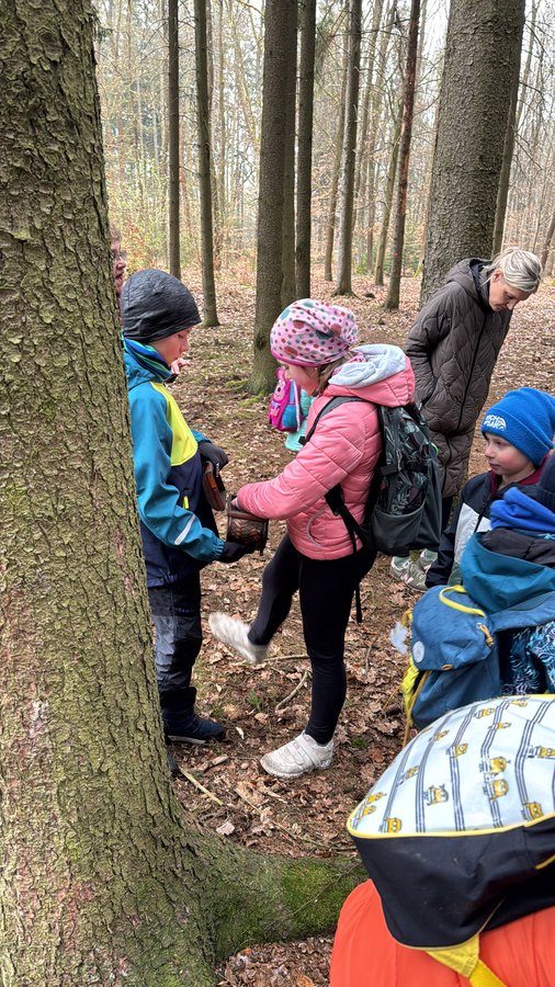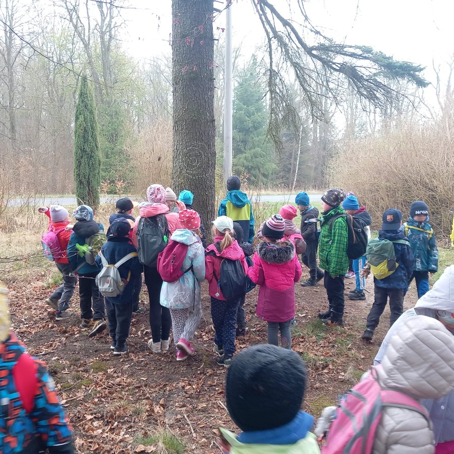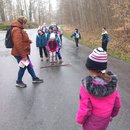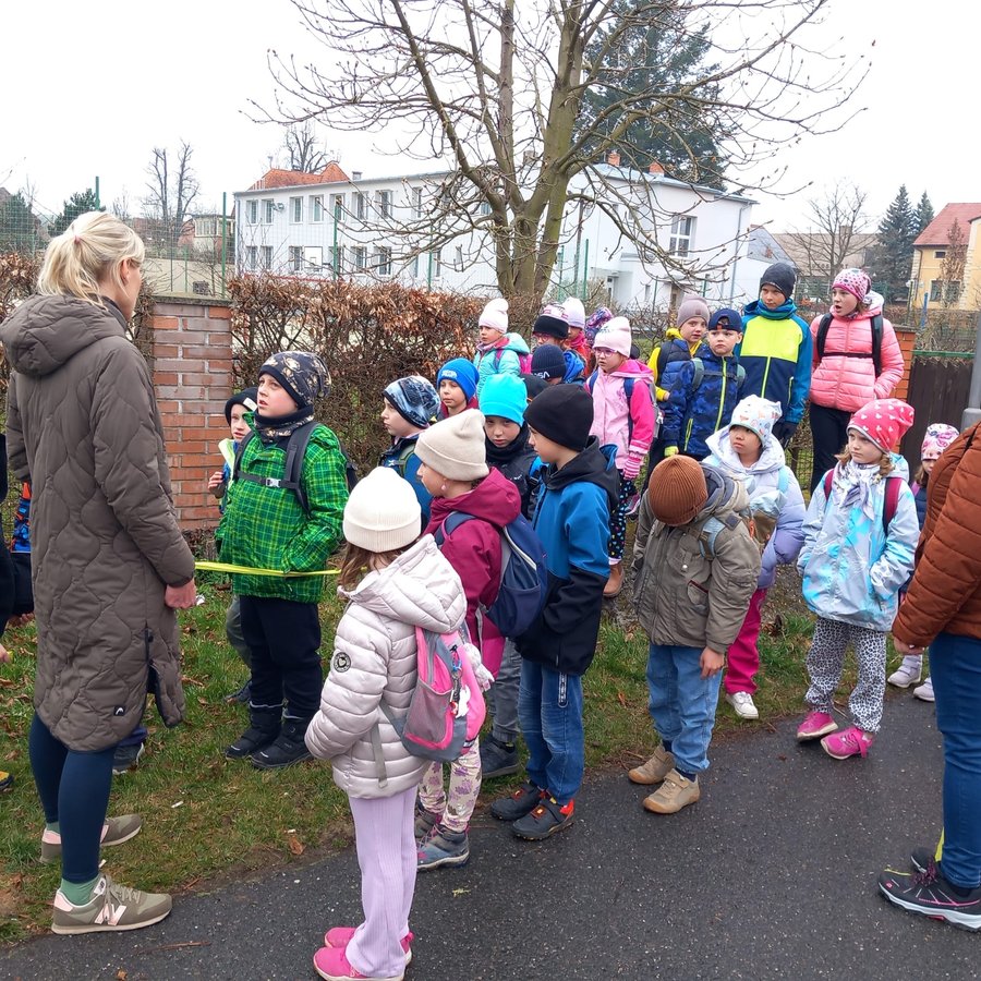 V pátek se družina vydala na dobrodružnou vycházku, při které děti hledaly obálky s úkoly a otázkami. Byli jsme rozděleni na dvě skupiny starších a mladších dětí. Starší skupina vyrazila o 15 minut dříve, aby připravila trasu, po které se později vydala druhá skupina. Křídami dělaly děti z první skupiny šipky na zem, různě věšely fáborky z krepového papíru a na pěti místech schovaly obálku s úkoly a otázkami. Naše trasa začínala od školy, poté za sokolovnou, kde byla první obálka. Dále jsme šli ulicí Berounská až k bráně, poté kolem Lesní správy do lesa, až jsme nakonec došli k tenisovým kurtům, kde byl schovaný poklad. První skupina poklad důkladně schovala, pak se schovali všichni, aby mohli překvapit druhou skupinu.
