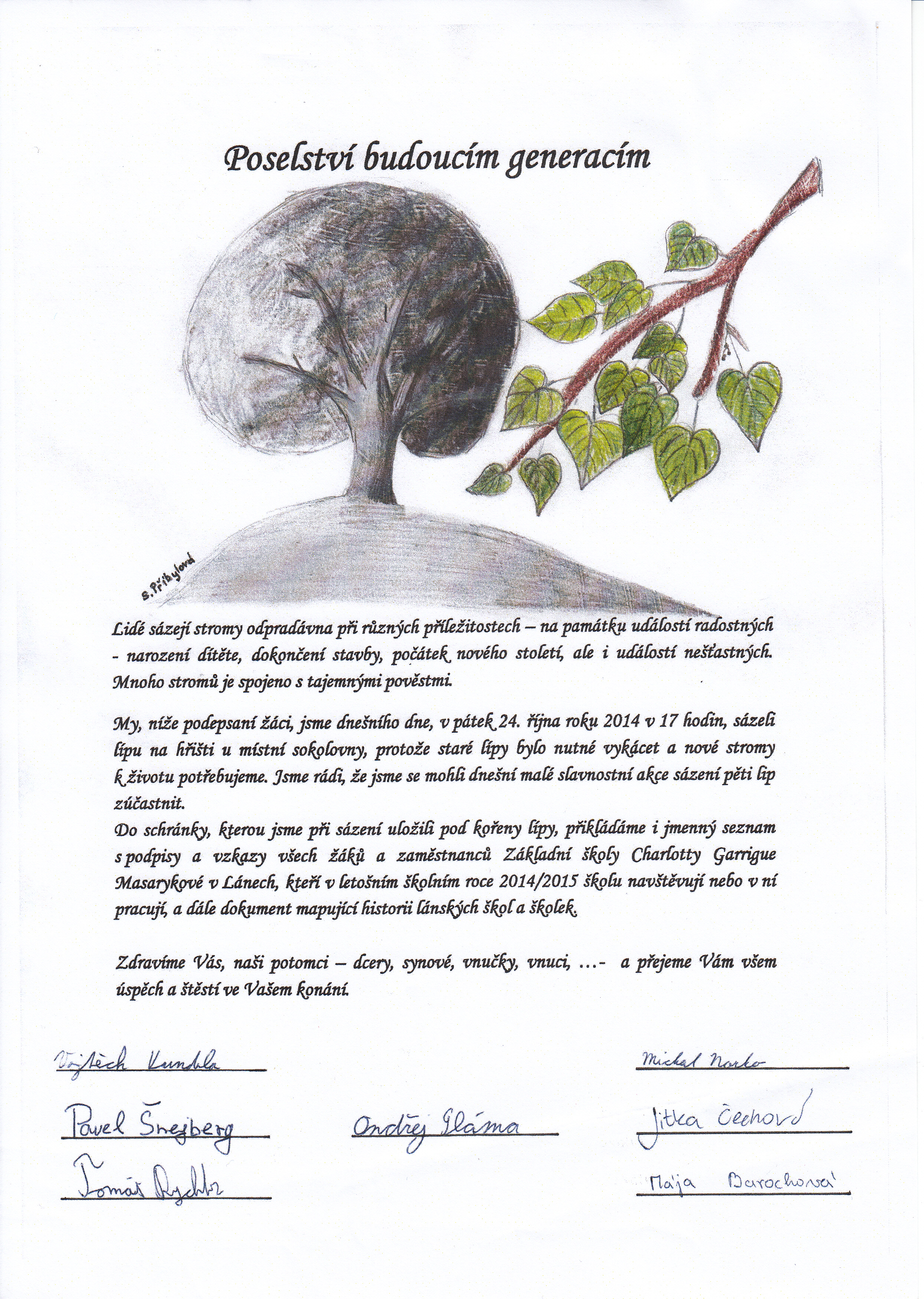 V pátek 24. října v 17 hodin jsme na hřišti za sokolovnou vysadili lípu, k jijímž kořenům jsme uložili neprodyšnou schránku. Do ní byl vložen dopis "Poselstvím budoucí generacím" s kresbou lípy autorky Sofie Přibylové ze 7. třídy a s podpisy žáků, kteří pomáhali hloubit jámu a sázet. Na návrzích průvodní kresby dopisu pracovali všichni žáci 7. třídy. Nejzdařilejší byly dva obrázky, a to obrázek Sofie Přibylové a Tomáše Zaorala. Sofiin obrázek pak vybrala mimořádně svolaná žákovská rada.