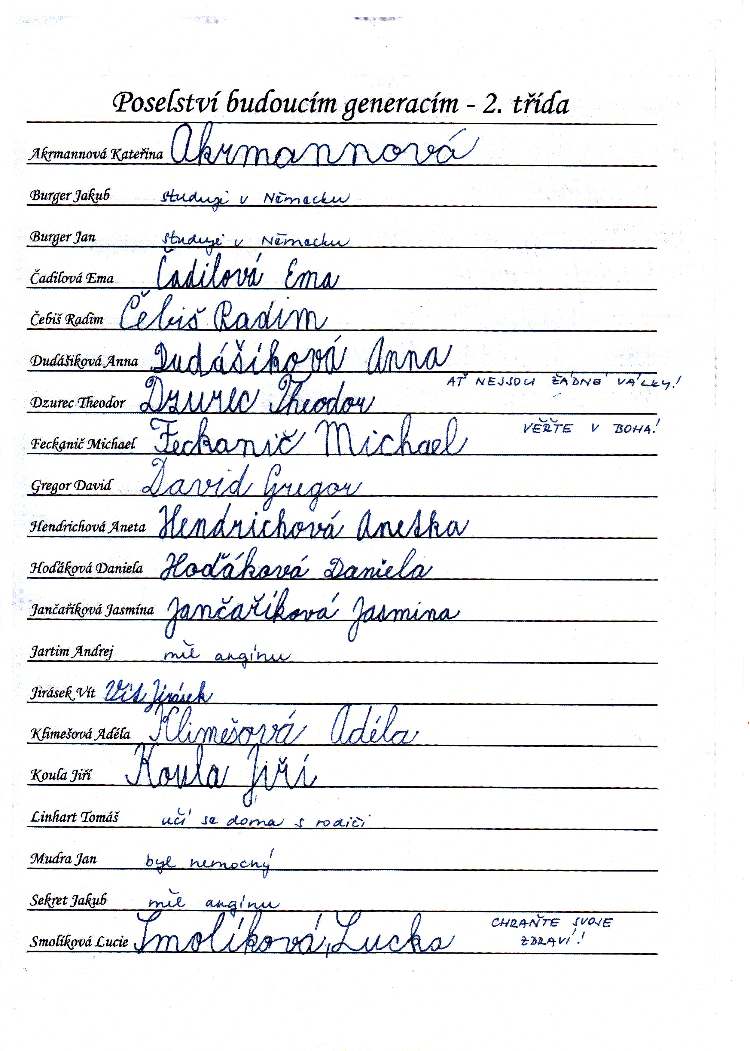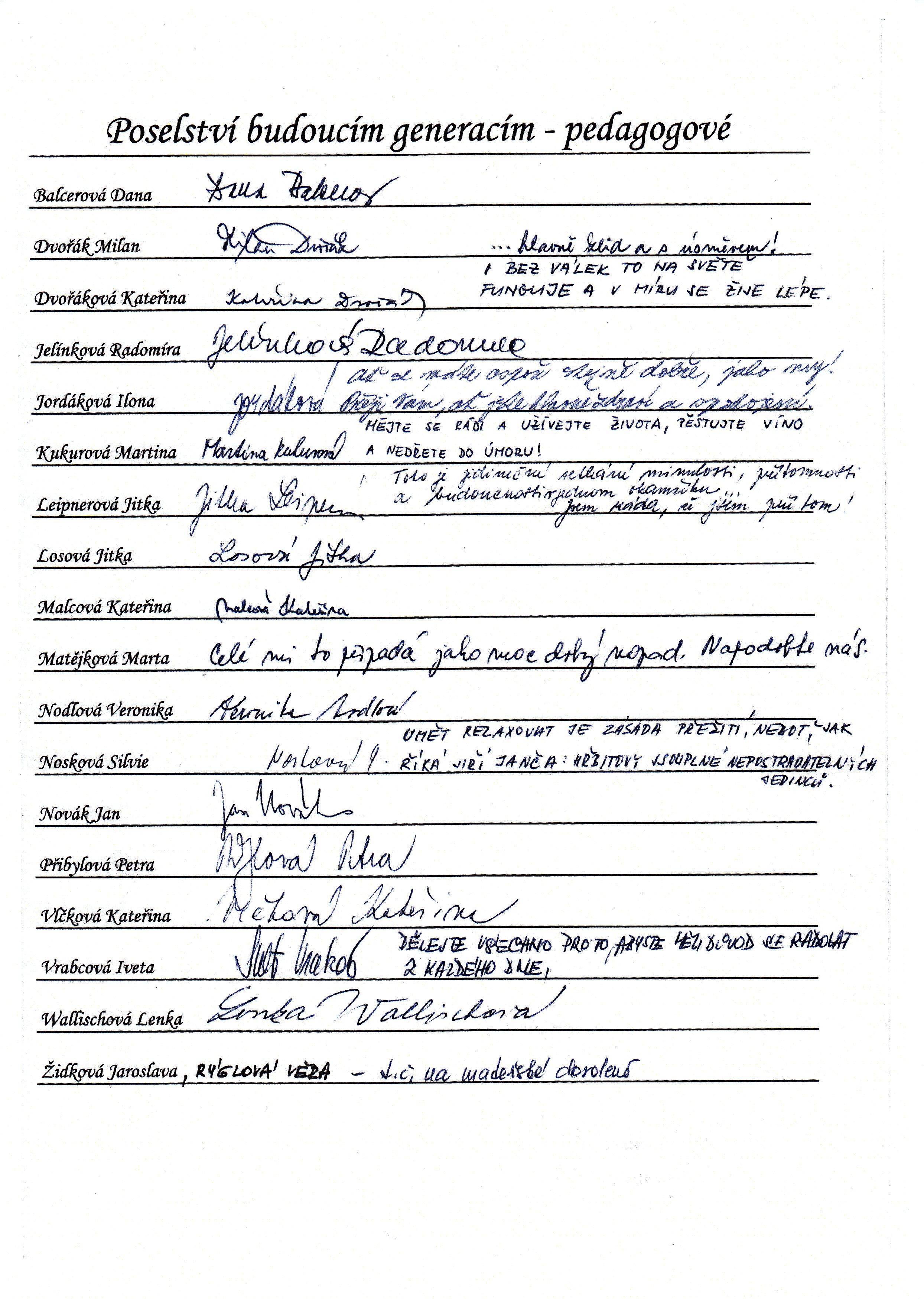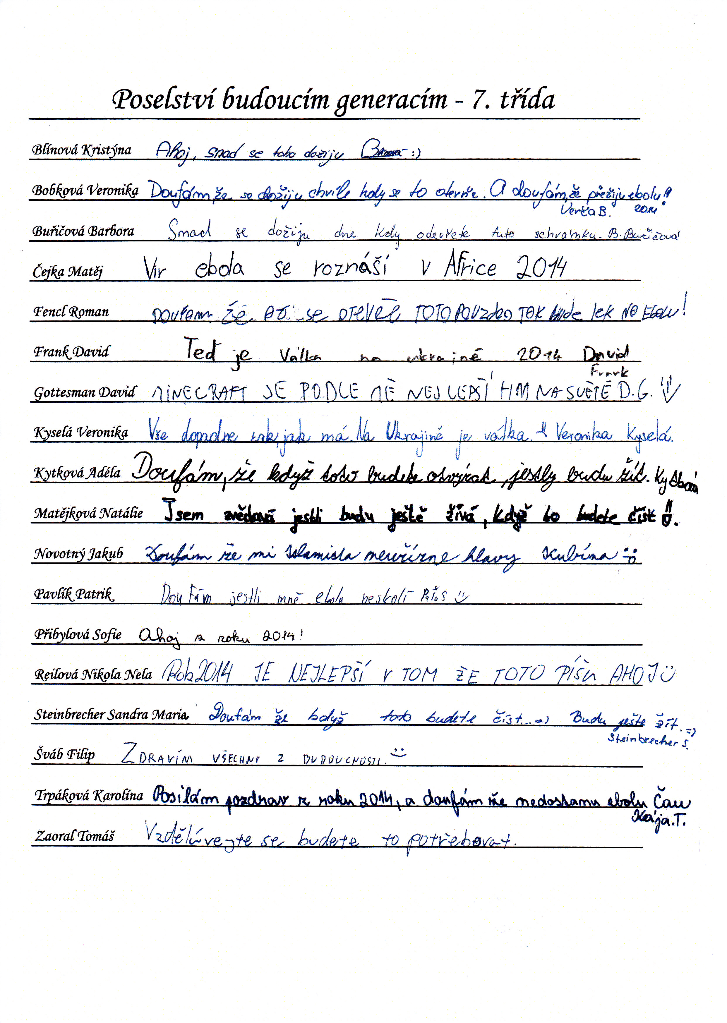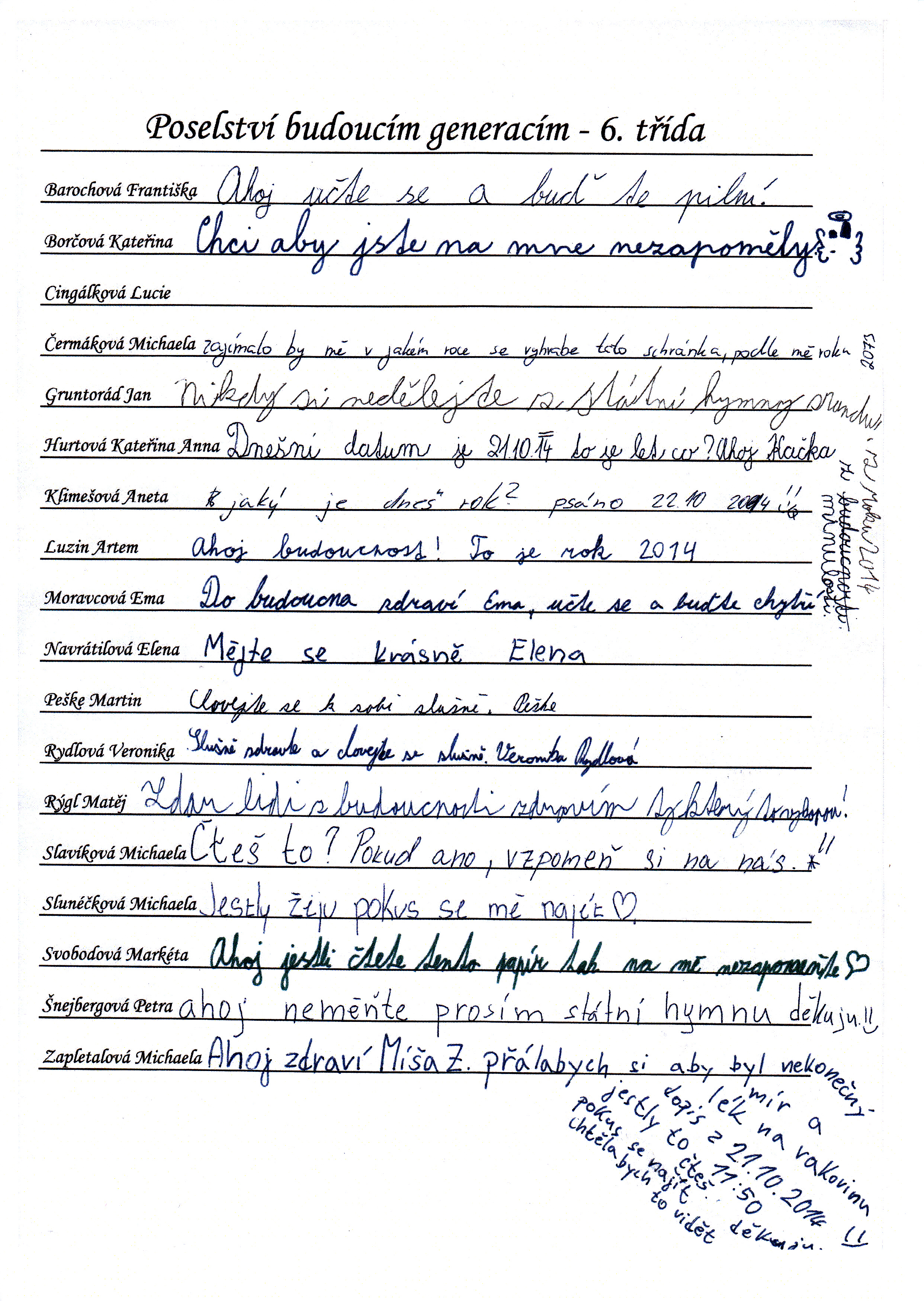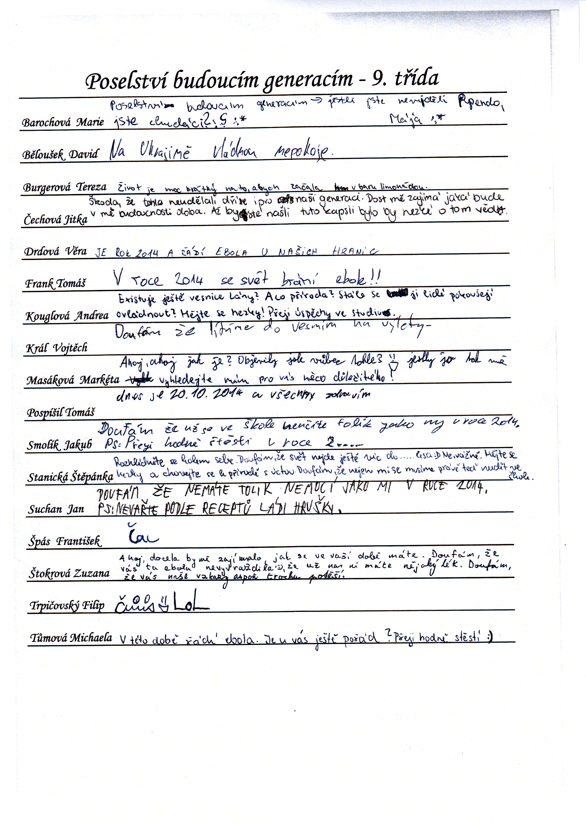 Do schránky jsme dále vložili jmenné seznamy žáků, pedagogů a provozních pracovníků, kteří ve školním roce 2014/2015 školu navštěvují nebo v ní pracují. Všichni se ke svému jménu mohli podepsat, případně napsat nějaký vzkaz pro budoucí nálezce. Také jsme přiložili "Průvodce historií lánských škol", který škola vydala v roce 2012 u příležitosti 80. výročí od jejího otevření.