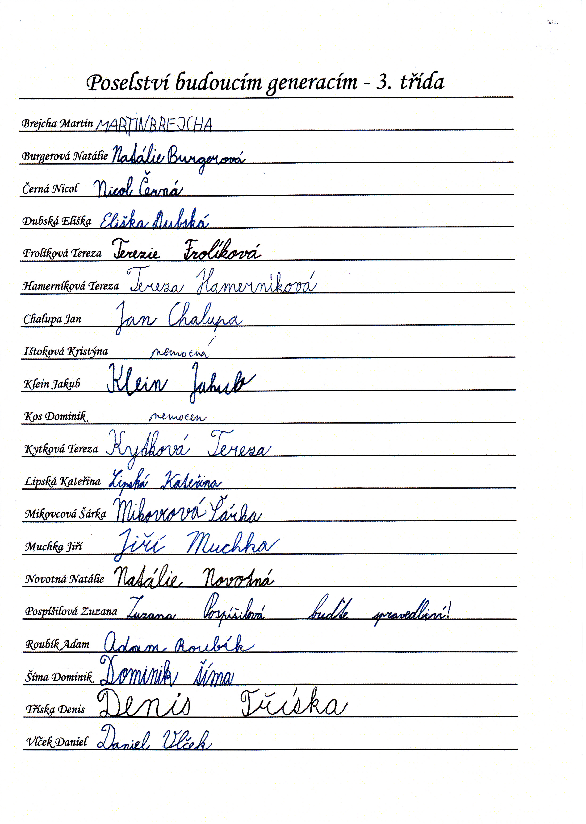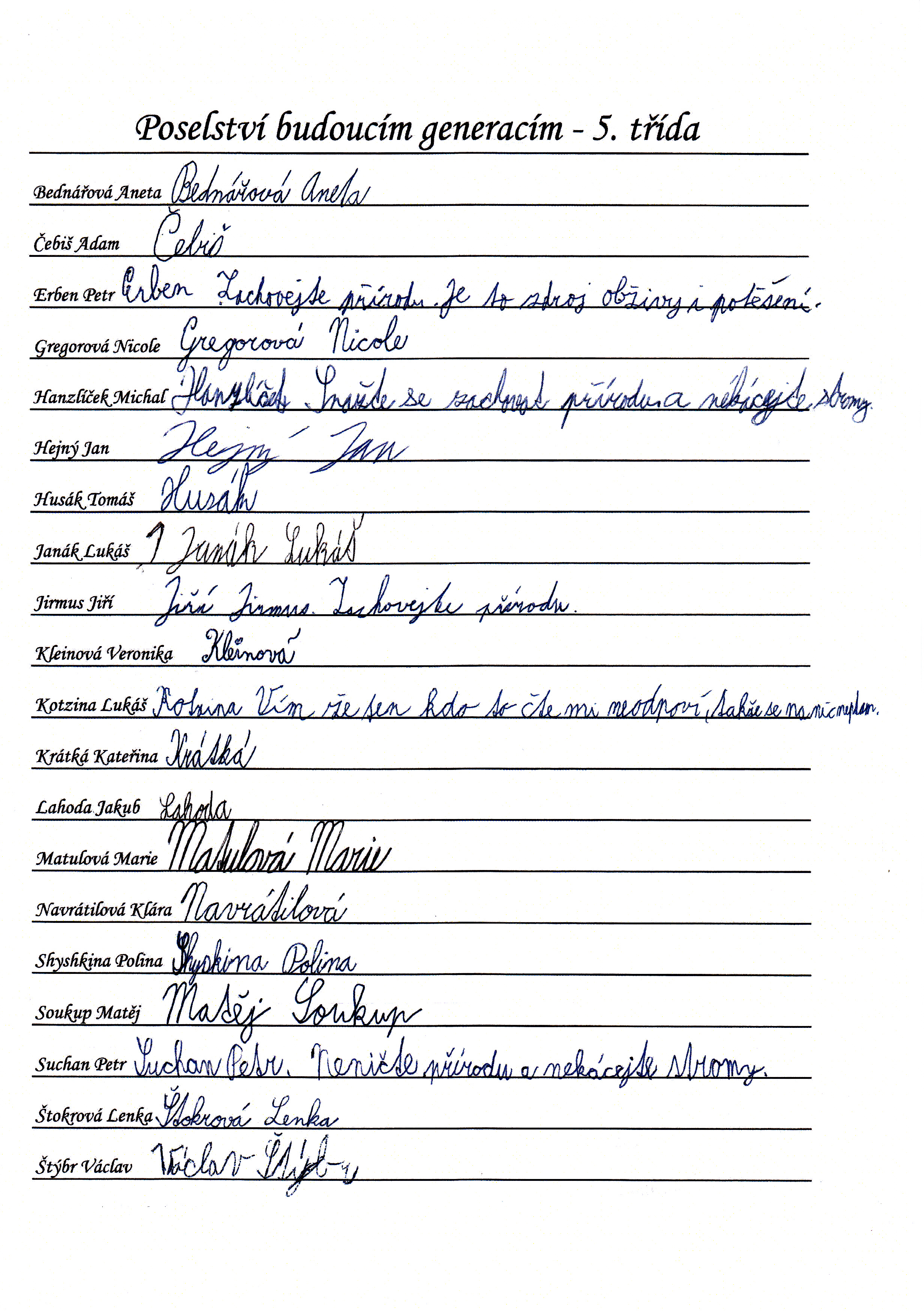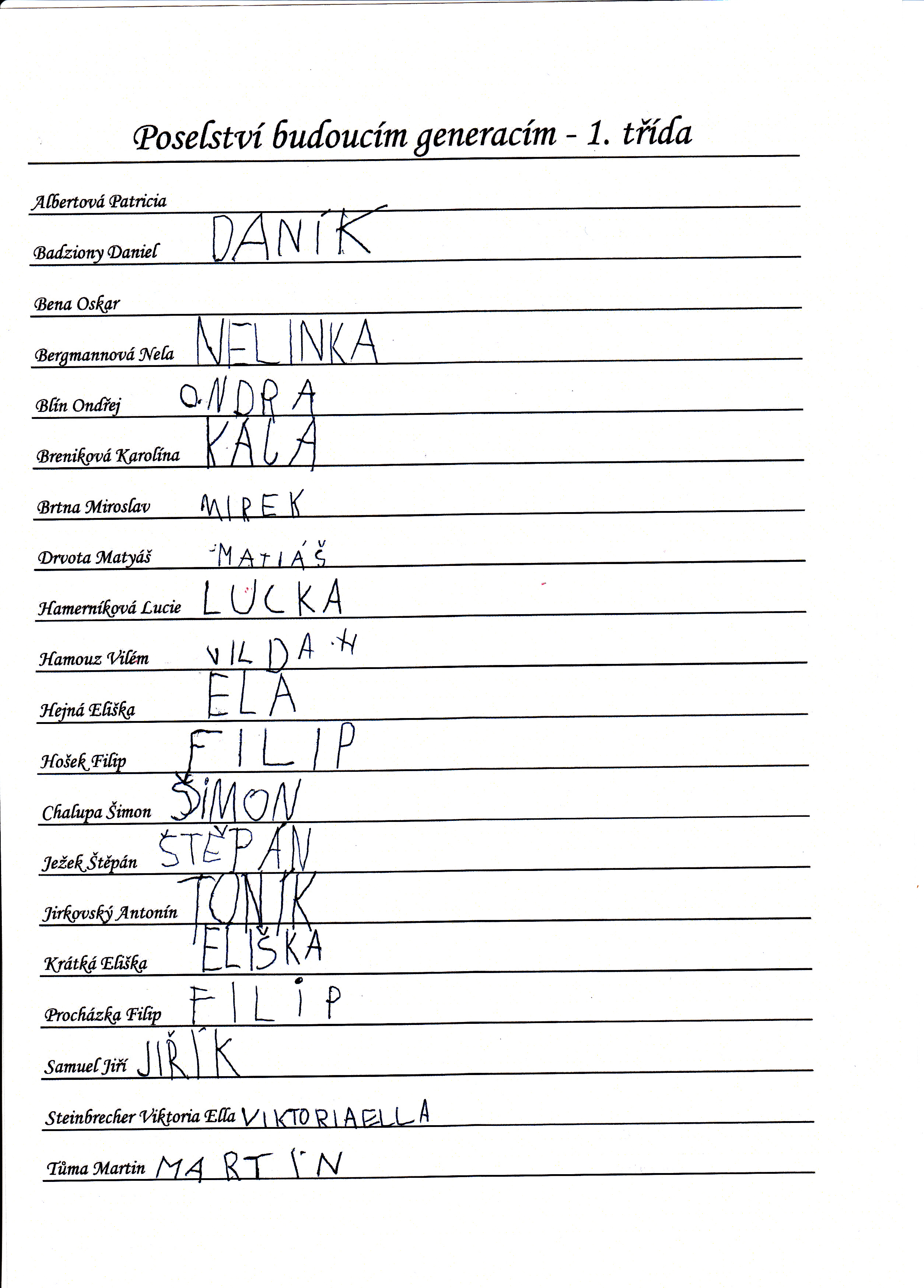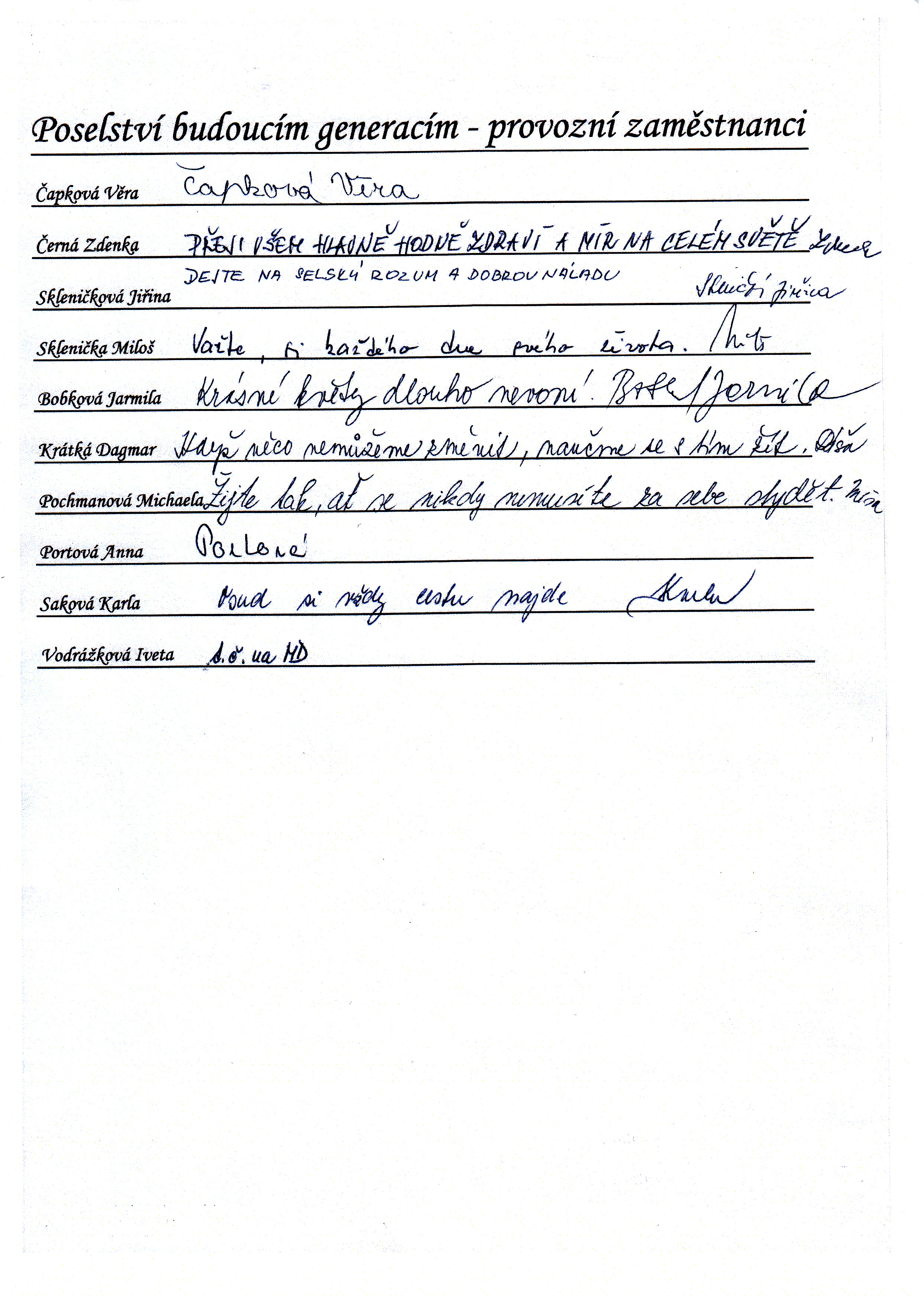 Do schránky jsme dále vložili jmenné seznamy žáků, pedagogů a provozních pracovníků, kteří ve školním roce 2014/2015 školu navštěvují nebo v ní pracují. Všichni se ke svému jménu mohli podepsat, případně napsat nějaký vzkaz pro budoucí nálezce. Také jsme přiložili "Průvodce historií lánských škol", který škola vydala v roce 2012 u příležitosti 80. výročí od jejího otevření.