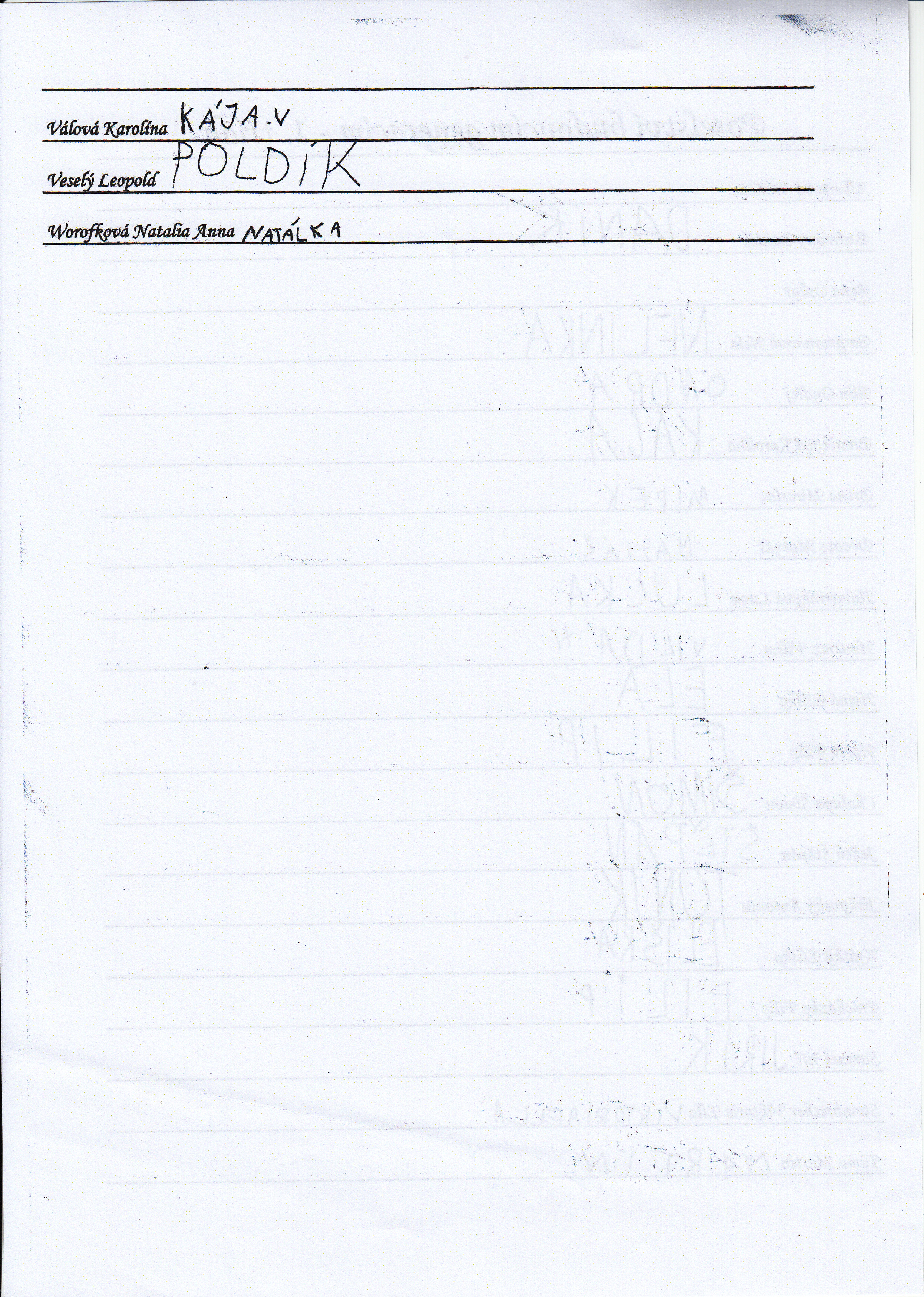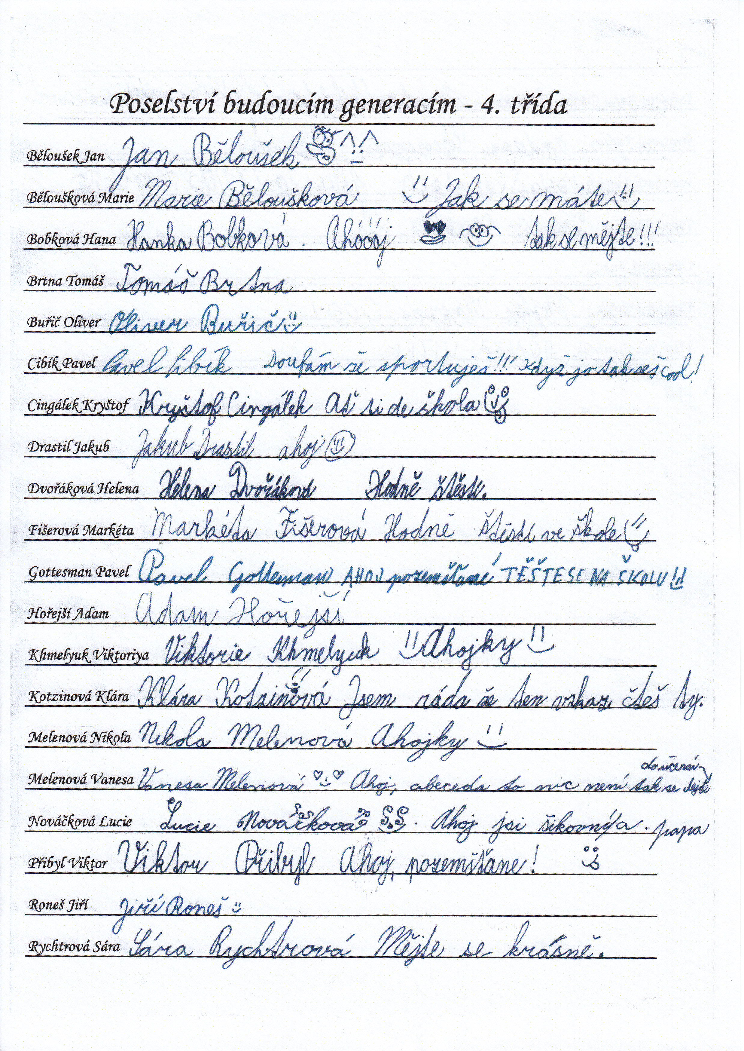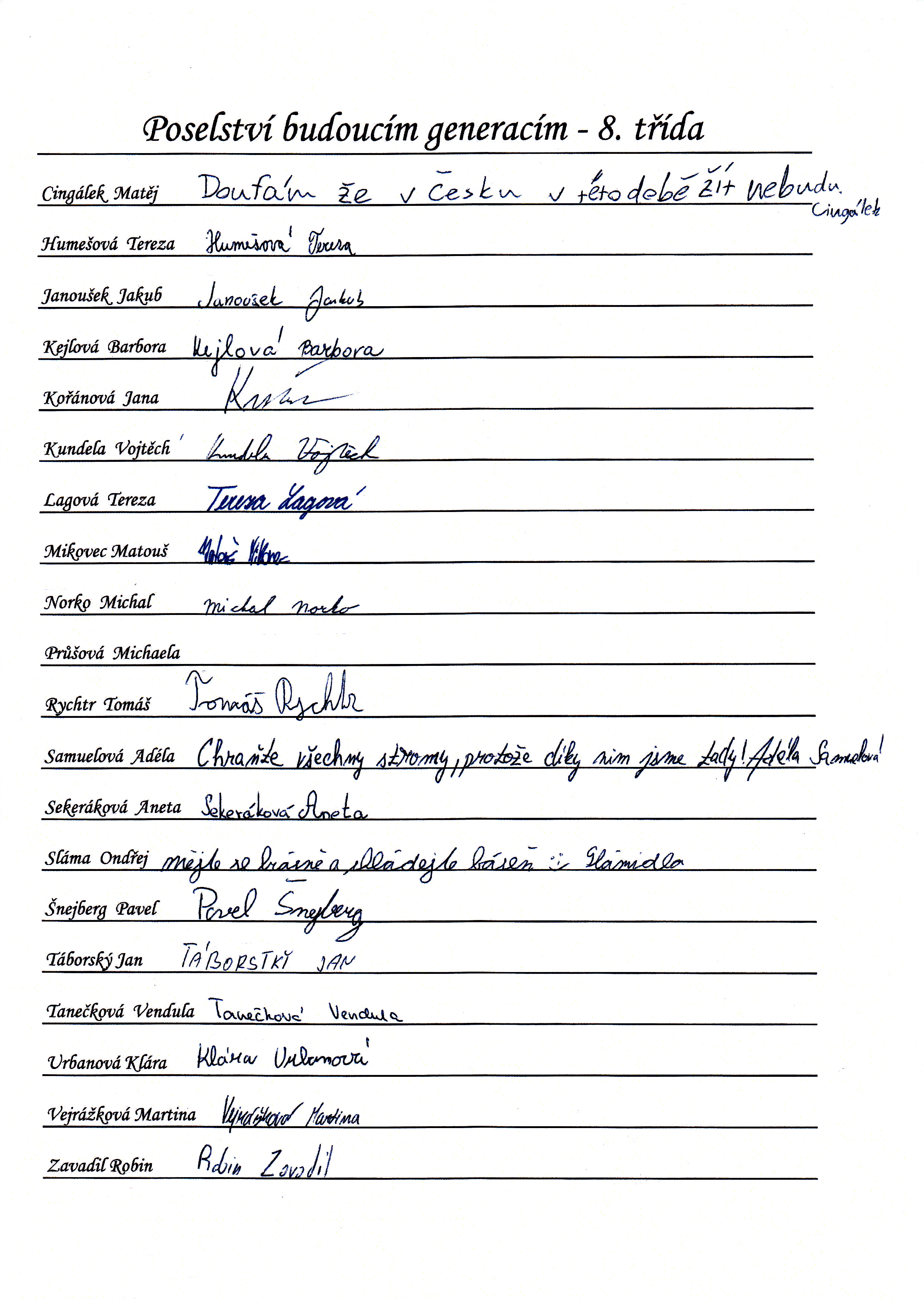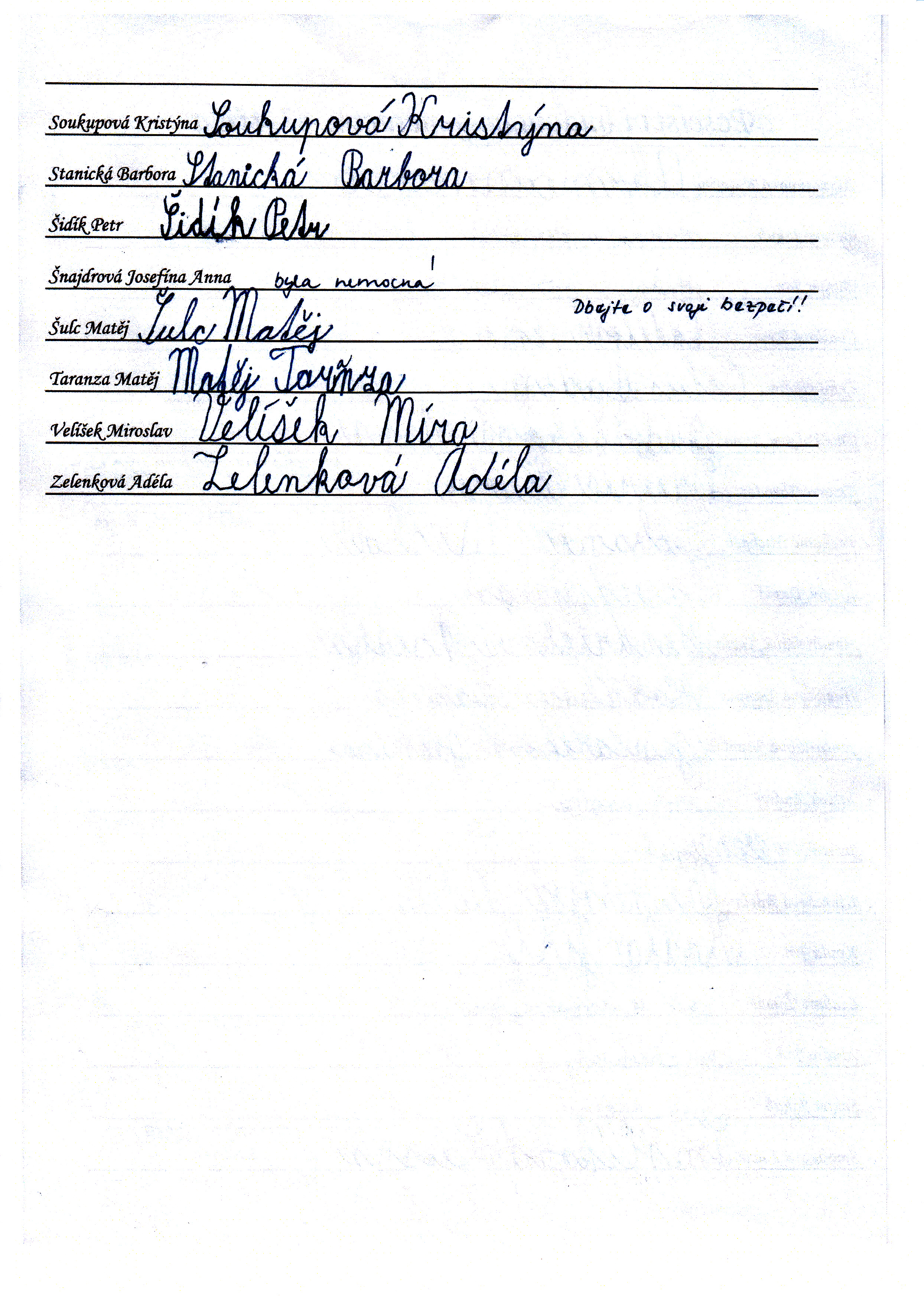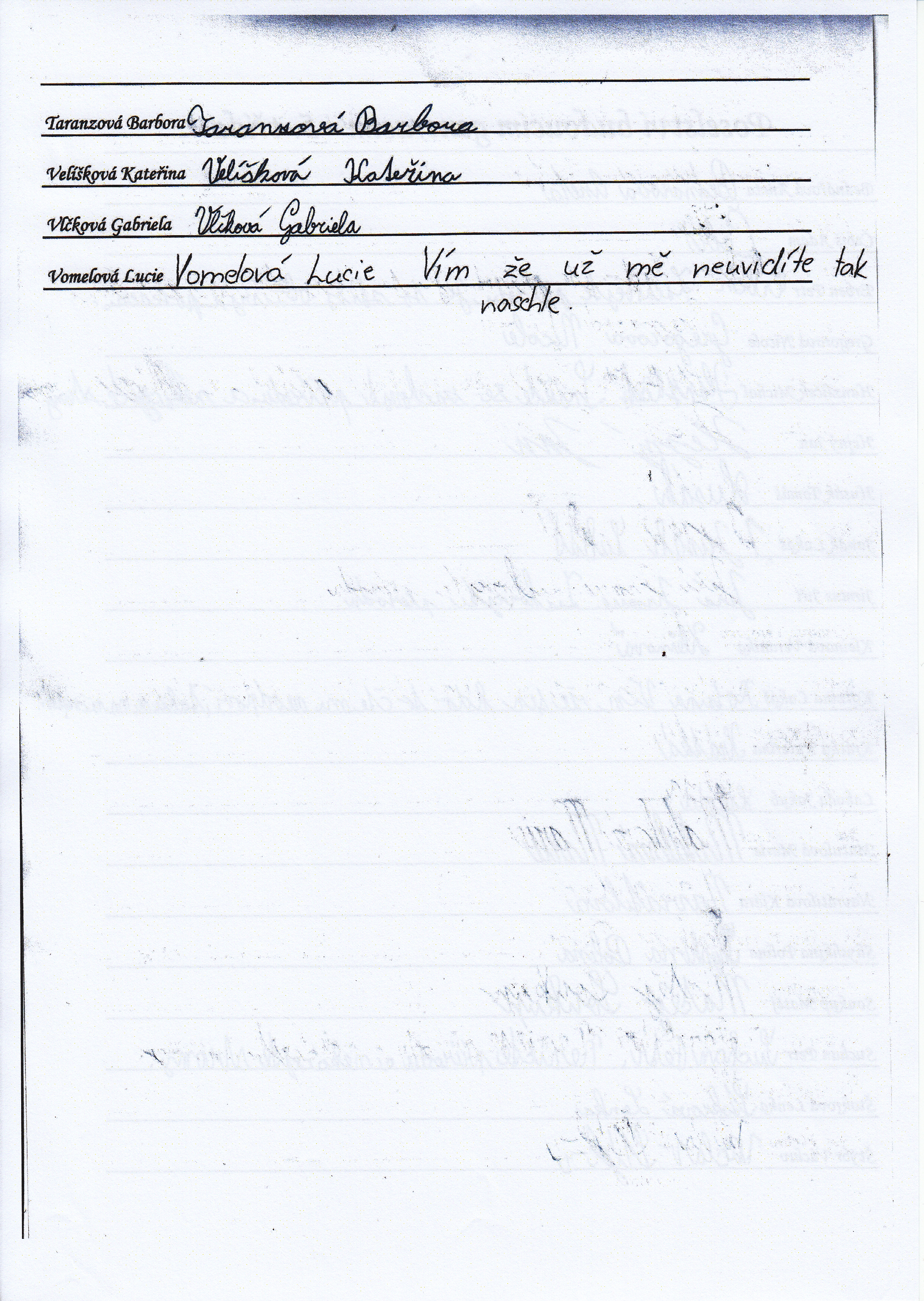 Do schránky jsme dále vložili jmenné seznamy žáků, pedagogů a provozních pracovníků, kteří ve školním roce 2014/2015 školu navštěvují nebo v ní pracují. Všichni se ke svému jménu mohli podepsat, případně napsat nějaký vzkaz pro budoucí nálezce. Také jsme přiložili "Průvodce historií lánských škol", který škola vydala v roce 2012 u příležitosti 80. výročí od jejího otevření.